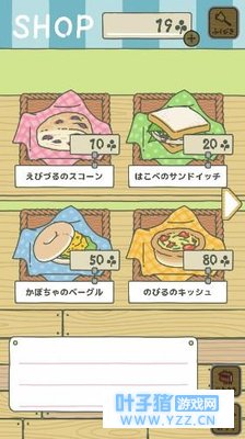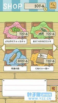 进入屋子右下角有两个包裹,点入后会进入商店,里面有各种食物还有钱包和道具,一刀刚玩也不太清楚,总之幸运草够就可以买,为出行做最后准备。