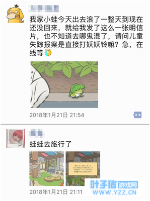 至于蛙儿子什么时候启程、什么时候回家,全看他自己的心情。在等他出门或是回家的期间,你无非就是上线收一收院子里的三叶草,再或者确认一下是不是有蛙儿子的朋友来串门了,仅此而已。 远行后的蛙儿子会给你寄来不同的照片,有时是他独自一人的风景照,有时是他和小伙伴的情景照。你能做的也只是保存到自己的手机,或者分享出去。 听起来很无聊是不是?因为养蛙的过程,既不像赢得一场《王者荣耀》的比赛那样可以获得十足的成就感,也不像在《阴阳师》中首抽SSR那样可以晒一晒羡煞旁人的好运气,你无法在朋友圈秀自己的战绩,更无法向别人炫耀自己的手气,你能做的只是独自一人守着蛙巢,或看着自己蛙儿子的萌样子窃笑,或等着自己的蛙儿子兀自心急。 这样一个“盼儿归、望儿笑”的过程,真的就像是父母对儿女的情感一般。于是,这款单纯的小游戏,激发了广大玩家的父性/母性,深陷其中、无法自拔。 04 我们这些蛙爸、蛙妈们抱怨最多的,就是“我蛙儿怎么还不出门”以及“我蛙儿怎么还不回家”。除此之外,就是“蛙儿子包里的吃的够不够”以及“蛙儿子有没有交到小伙伴”。