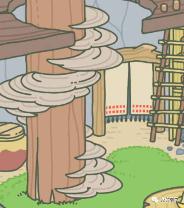 卧室的木床靠两根木条撑住,利用木头的韧性制造出床的弹性。而床头因为紧靠烟囱,为了防止不小心烫到,所以包了一圈布条。 二楼没有隔墙略危险,也怕一不小心睡不踏实直接翻滚摔到一楼,蛙君在楼板边缘布置了一排栏杆木桩,考虑得相当周全,不亏是一只稳重的佛系蛙。