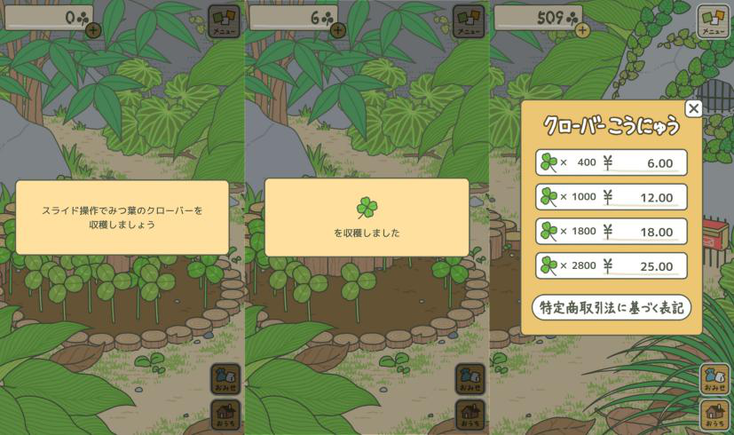 庭院内的田地,随时间长出三叶草,日常采集三叶草作为货币。偶尔掉落的四叶草作为一次性护身符使用。三叶草数量处的【+号】进入氪金页面,不要问我怎么氪,佛系玩家心如止水。