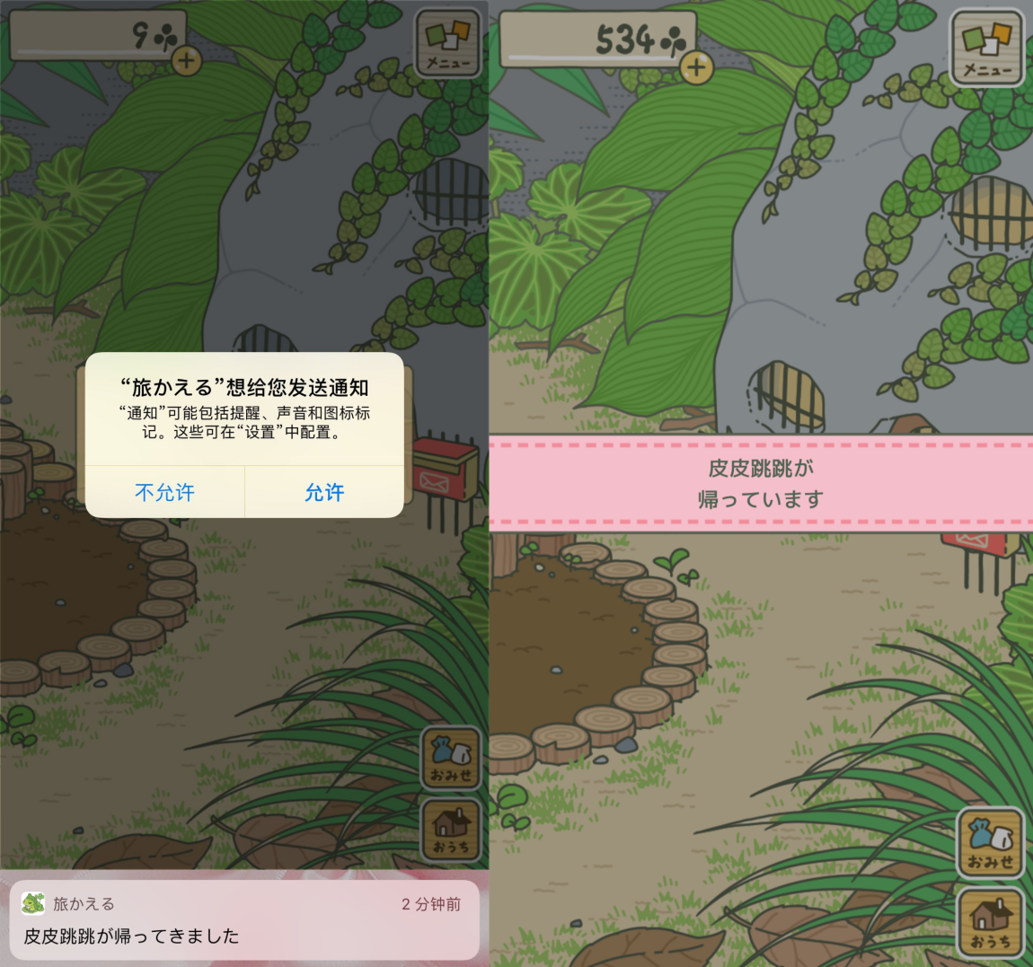 一定要 允许通知 ,因为这样你才能第一时间知道你的青蛙回来了!它真的是个很有个性的小家伙,去哪儿?去多久?你通通不知道,只有靠系统通知和它回家带回来的照片和特产才知道它去了什么地方!想要第一时间见到你可爱的青蛙一定要记得打开通知啊!