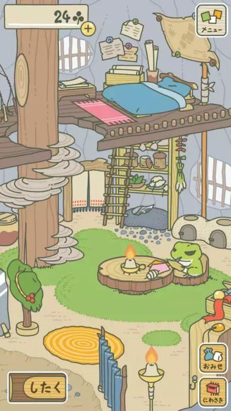 很多人在微博里感慨,真的第一次在小青蛙身上第一次真正体会到母亲对游子“临行密密缝、意恐迟迟归”的感情。 为大家会对这款玩法简单的游戏欲罢不能?三文娱认为有如下几点: 1、足够治愈的萌系元素 《旅行青蛙》其实延续了Hit-Point公司前作《猫咪后院》一贯的游戏画风设计,聚焦在萌元素的设计和运用上。 不论是庭院还是屋内的设计都采用了相对柔和淡雅的颜色作为主色调。背景设计中“门帘、烛光、地毯、衣帽架、屏风”等元素无一不精致贴心。 而对食物和道具的设定则都有相对应的真实物件进行参照,旅行的明信片也根据日本特色景点进行深度还原。