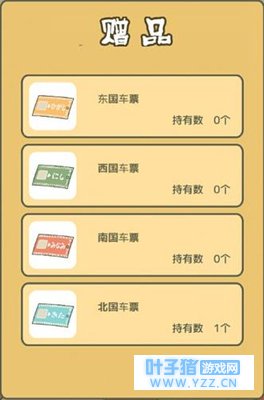 4. 车票 :抽奖池的黄色球里获得,为一次性物品,功能是使青蛙朝对应颜色代表的方向做长途旅行 黄色:东国车票 白色:西国车票 红色:南国车票 蓝色:北国车票