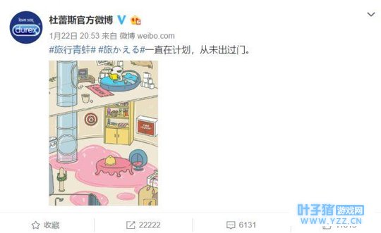 ▲ 大V安利《旅かえる》 更有意思的是,营销界网红杜蕾斯也迅速蹭起了这个热点,发文时间也是在22日当晚。