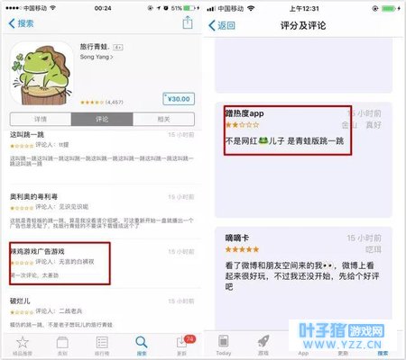 让我们看看在这24小时内发生了什么! 因为《旅かえる》被清词,所以大量在微博微信上被安利的用户进入App Store,通过关键词搜索的时候只能看到《旅行青蛙.》。很明显,这个开发者还引导用户评论,加上很多用户下载之后发现上当了,因此该App在短短1天内迅速累计了7000多评论。想到这还是一款 30元 的付费应用,你会瞬间被击中! 而且,该开发者为了不浪费流量,还内置了 大量广告 ,真够环保的。