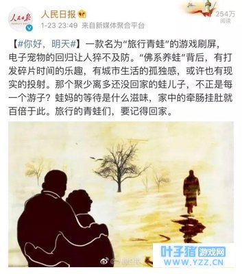 03 玩家——孤独 《旅行青蛙》出来后,很多深度文章分析它爆红的原因。有文章认为,它抓住了玩家内心敏感而柔软的部分,玩家并不期待从游戏中争强好胜,渴望成功,只是想花点时间享受属于自己的安静。这也是“佛系青年“的特点。 甚至有网友说,自己玩出了“空巢老人“的感觉,时时刻刻盼望着孩子回来。于是有媒体很巧妙地发了一条应景春节的微博↓↓↓旅行的蛙们,记得回家。
