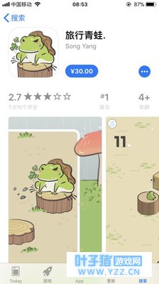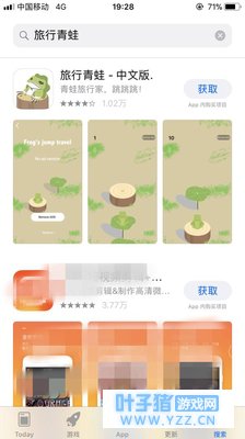 可是,还没上车的朋友们就着急了。有人说,没上车直接去应用商店下载就好了啊,可是事情要是这么复杂就没这篇文章了。 于是,一个想上车的乘客,在一个夜黑风高的夜晚,打开App Store,想着大家都叫这个游戏“旅行青蛙”,那直接搜索就行了啊。于是乎,乘客踌躇满志,点击商店下方搜索,输入“旅行青蛙”,整个动作一气呵成。咦,还有中文版,好棒。