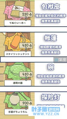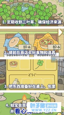 在商店(右下角蓝白包裹图标)中,玩家可以购买便当和道具。便当是必需品,蛙宝饿了就不会行动,便当质量也直接关系到蛙宝回家所带的礼物,而道具和护身符则会影响到蛙宝旅行的目的地和时长。购买物品后,玩家可以在屋内点击左下角的“收拾”木头图标,进入包裹界面,将东西准备好。 而一切运营,从收割三叶草开始:每隔几小时查看一次,收割的三叶草将成为游戏中的货币,让你为蛙宝买各式各样的东西,偶尔还会有可以当作护身符的四叶草。收割后的操作,让深度娘用一张简图说明吧: