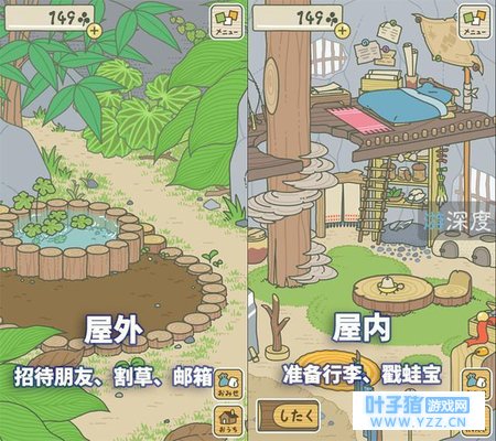 初期:学会哥的运营,剩下的只要等就行了 新手阶段,玩家可能会对日文界面感到懵逼,但实际操作上并不困难:你只需要认识屋内屋外、商店、包裹这四个场景即可。屋内与屋外可通过右下角的邮箱/屋子图标切换,屋外主要是收割三叶草、开邮箱、迎接客人时使用,而屋内则是和青蛙互动、帮蛙宝收拾包裹时使用。