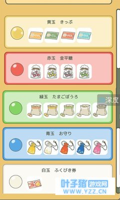 在商店右上角可以用抽奖券进行抽奖,抽奖可以获得用以招待朋友的金平糖(红球)、指定方向的车票(黄球)、增加指定方向概率的护身符(蓝球)、能指定目的地和增加交友几率的小圆面包(绿球),以及安慰奖抽奖券(白球)。通过这些抽奖奖品,蛙宝的相册和特产收集就更为方便了。