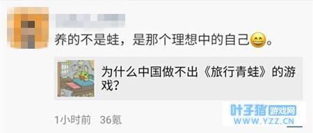 也有人说,这个游戏养的不是青蛙,是自己。大城市生活的压力下,有多少人想要去旅行、写作、摄影,但只局限于是个梦想。仅仅是个梦想,这只小青蛙替他们做了。它可以无忧无虑去旅行,可以回家用大把时间写作,可以把旅行拍的照片带回家,还可以在路上交个朋友。而且有人为他准备粮食和钱财,这不就是我们的梦想生活吗? 但是,你需要上班赚钱养活自己,青蛙不用。试问,有多少人能说一句“世界这么大,我想去看看”之后,真的辞职去旅行呢?有家庭、房子、孩子要养,而青蛙,帮你实现了梦想。 为什么你没有勇气自己实现梦想?而让一只小青蛙替你实现?当然是因为穷限制了你的梦想。 但为什么穷呢?先来看看朋友圈的各位都是怎么看这个游戏的。