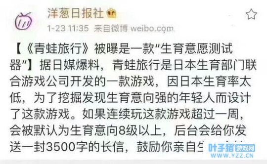 这是我的名字——《旅行青蛙》 主角是一只可爱的小青蛙,你可以给它取名字。通过收集三叶草去商城买东西,有食物、幸运符、道具。青蛙带着这些东西就会出门旅行,然后旅行途中会邮寄照片,回来还会给你带当地的土特产。 昨天女朋友一早起来就跟我说:昨天晚上我睡觉了,我们家蛙不打招呼就走了,万一走丢了怎么办,你去帮我找回来,那我要是走丢了怎么办,女朋友说那自己用导航回来,小编心里苦啊,现在我的地位还不如一只蛙了。 据说这是日本生育部门联合游戏公司开发的一款游戏,因日本生育率太低,为了挖掘发现生育意向强的年轻人而设计的游戏
