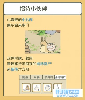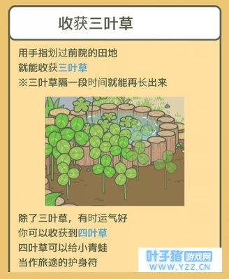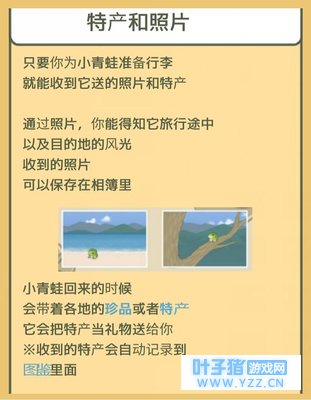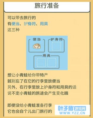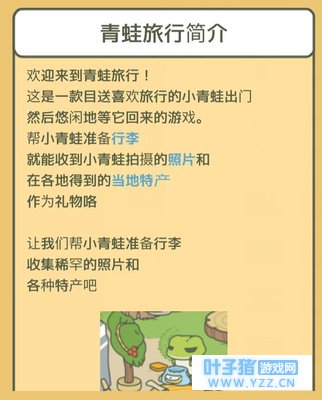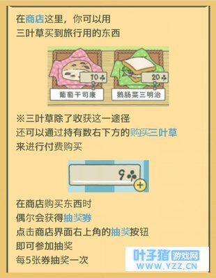 通过收集三叶草去商城买东西,有食物、幸运符、道具。青蛙带着这些东西就会出门旅行,然后旅行途中会邮寄照片,回来还会给你带当地的土特产。基础的操作不多说,来看看你的青蛙为什么不出门,而出门之后为什么不回来吧。