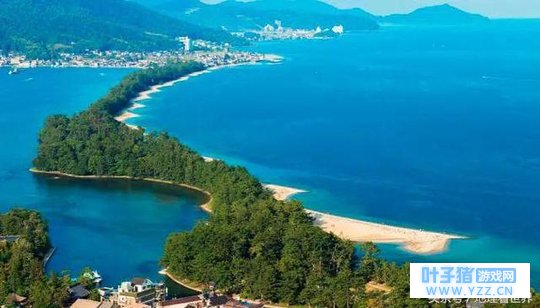 ▍京都府天桥立(真实场景) 天桥立位于京都府宫津市宫津湾,因为地壳的推挤作用,在海上形成一个沙洲地形,其西面是阿苏海(内海),东面则是宫津湾(属日本海)。据说由于其形似天上的白色架桥,所以取名"天桥立"。天桥立的沙洲上有自然的日本黑松树林,数量高达8,000棵以上。