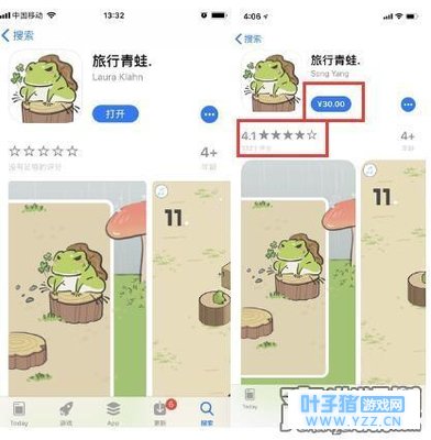 在苹果商店搜索“旅行青蛙”就会看到这款游戏,进去之后发现玩法跟微信小游戏“跳一跳”一模一样,根本不是朋友圈中的那款《旅行青蛙》。这款山寨游戏的出现已经让许多小伙伴中招,大家一边骂无良商家是骗子,一边骂苹果的审核不严格,给了骗子可乘之机。