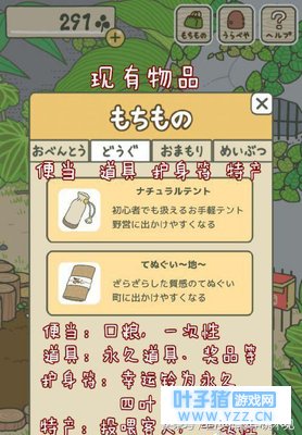 背包:《旅行青蛙》游戏的背包(现有物品)中有食物、道具、幸运物品和特产几种。