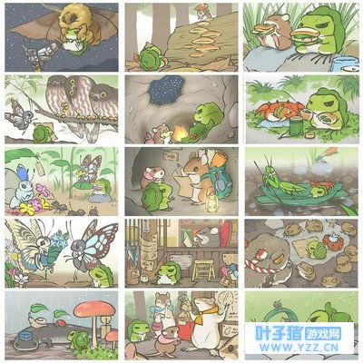 道具明信片 获取难度:一般~困难 特点:难度主要在道具上,如果草攒够了那么也就没什么难度 当出现这些场景又没带道具时,你蛙会用草叶子或者别的东西临时凑合一下……有些场景好像只能出现特定的动物。 路边 蝴蝶老鼠螃蟹都可能出现,各种包袱皮都会出现,不限于我举的例子 玄学:各种包袱皮,(抽奖)绿色毛豆面包,普通食物,出门时间短 咖啡馆门外