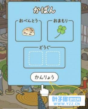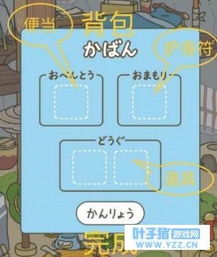 旅行青蛙 【整理背包】背包由三个部分组成:おべんとう(便当)おまもり(护身符)どうぐ(道具)按照图片指示整理好背包点击「かんりょう」(完成)就好啦。