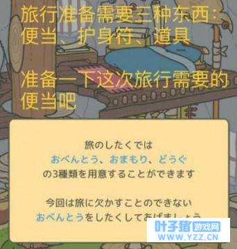 旅行青蛙 【开始游戏】旅行所需物品包括:便当、护身符、道具(这句话划重点,以后可能都会用到)