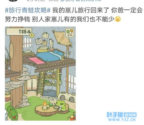 《旅行青蛙》的玩家控制不了游戏的走向,不知道自己儿子什么时候会出门,什么时候又会回家。 这种游戏反馈的随机性,让玩家在游戏过程中充满小小期待。 而儿子的突然回家和偶尔寄回的明信片,又出其不意地满足了玩家,符合了佛系青年的心理。 这款游戏在佛系风口推出,顺应了当今的趋势,也是其迅速爆红的的原因。 3.清新略萌 这款游戏只有四个界面:庭院,房子里,杂物间,商店。