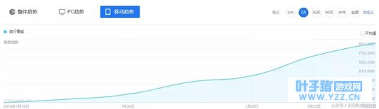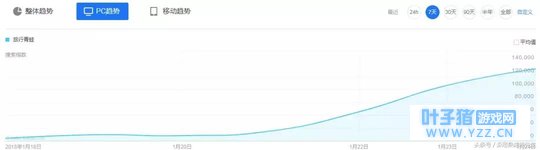 为什么这款听上去很无聊的游戏却火爆程度惊人? 小编认为,这款游戏具有如下几个特性: 1)专属性,每个玩家的“蛙”儿子都不一样,在玩家主观上看来,每个蛙都属于玩家自己; 2)休闲性,一直以来的竞技类游戏带来了审美疲劳,一款休闲游戏很容易吸引大家的注意,这款游戏不占时间,偶尔打开看一眼就可; 3)情绪性,青蛙独自一蛙做着一切事情,唤起了人们心底对家的情绪,玩家像家长一样对着它唠唠叨叨,在家待久了盼着它出去,出去久了盼着它回来,对他的旅途充满期待; 4)无压力性,时下的青年都承担着巨大的生活压力,他们需要放松,这款养蛙游戏十分适合。 所以,它火了。那么它到底有多火呢?通过旅行青蛙的百度指数数据,我们可以窥见一斑。 过去一周搜索指数整体趋势 从上图可以看出,旅行青蛙的搜索指数整体呈直线上升的状态,而且还在继续增长。 PC端搜索指数趋势