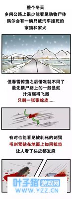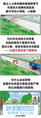 你的蛙儿子没有被风吹跑 没有被雷劈到 也没有被食物链顶端的贝爷吃掉 却死在了车轱辘底下 是不是心塞的不要不要的?! 在修建动物通道的时候 人们考虑的仅仅是 被列为国家级保护动物的珍稀品种 而大多数普通小动物却从不曾享有这种待遇 你的车轮下曾碾压过几只小生命? 你是否想过正因为我们需要路 而让它们无路可走? 请设计者、施工者们多考虑一下不起眼的它们 给普通小动物们留条“生路”吧 这样你的蛙儿子才能 真正地仗剑走天涯 |