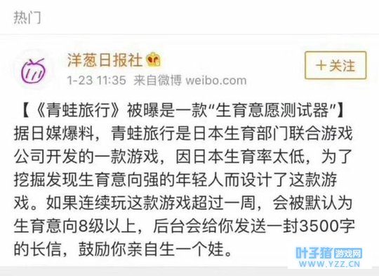 《旅行青蛙》的走红折射出人们的生育观念:既不想生育儿女,又想体验下为人父为人母的乐趣。 有人说,感觉自己就和现实中的父母一样。这些都在一定程度上验证了上面的观点。 但是,据爆料,《旅行青蛙》被爆是一款“生育意愿测试器”。