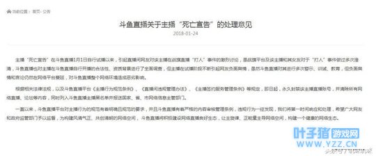 斗鱼发布公告宣布了对主播“死亡宣告”的处理意见,斗鱼表示“死亡宣告”1月1日在斗鱼直播自行试播阶段中不断引起网友负面舆论,负面舆论在网络平台蔓延,对斗鱼直播整个网络环境造成了恶劣的影响。故对其直播账号进行永久封禁,并列入斗鱼直播主播黑名单并报送国家、省、市网络信息主管部门。