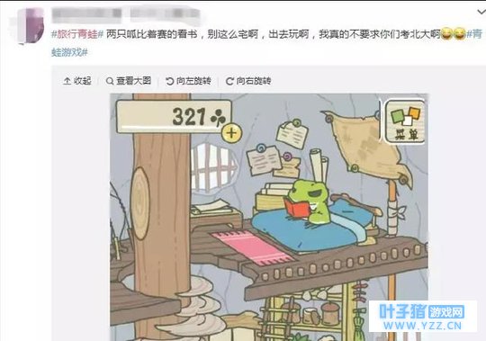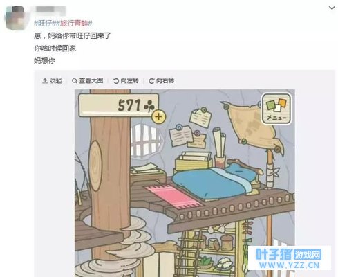 小青蛙不受玩家控制,有时乖乖的在家看书,也有可能来一场说走就走的旅行 心情好了,会给你寄几张外面浪的明信片,至于什么时候回家,就要随缘了~ 自从开始“养青蛙”,玩家们提前体会到了老母亲的不容易,为蛙儿子也是操碎了心 在家时嫌弃“儿子”太宅 ▼