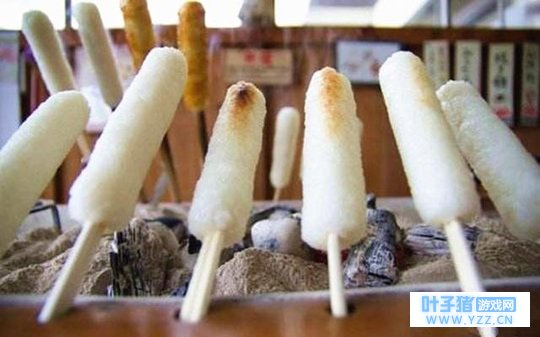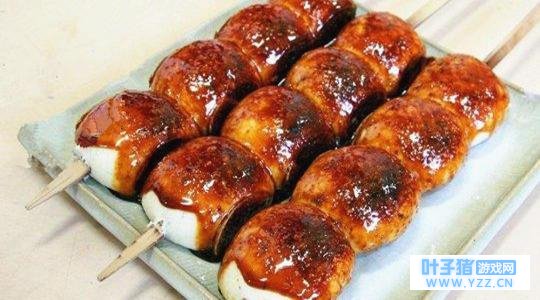 2.烤馒头 烤馒头是群马县的一种特色食物,将蒸好的馒头(有豆酱内馅)串在竹串上,两面都涂上黑砂糖或麦芽糖制成的浓郁甜面味增酱后放在火上,烤至出现焦痕,是一种很受欢迎的小吃。