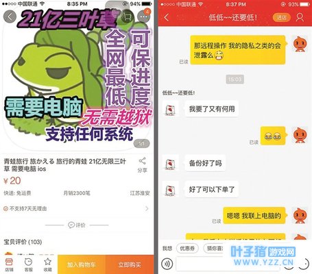 事实上,这款游戏是由日本一家游戏公司开发,目前在苹果iOS用户中,仅推出日文版本。记者也注意到,截至1月23日,“旅行青蛙”已经成为苹果App商店免费下载排行榜的第一名。 游戏中,三叶草的数量决定了青蛙的装备和目的地,但三叶草生长周期缓慢,购买费用较高,因此,部分商家瞅准商机,针对iOS手机用户,推出“花费20元即可购买21亿无限三叶草”服务,通过“外挂”操作,让玩家轻易获得大量三叶草。 记者调查发现,购买“无限三叶草”服务后,需要在电脑上按照教程操作或允许商家远程操作,但其间存在不少风险,或会造成手机中数据丢失,甚至泄露个人隐私。此外,1月23日,苹果客服告诉记者,这类“外挂”操作存在一定安全风险,甚至会泄露个人的ID账号,商家有可能借此勒索买家,造成损失。 网上“21亿三叶草”售价20至50元 1月23日,记者在网购平台检索“旅行青蛙”后发现,不少商家在出售“外挂”服务,售价从20元到50元不等。多名商家承诺,购买服务后,他们会提供“21亿无限三叶草”和“990奖券”,并且支持任何手机系统使用。而买家可以选择保留自己之前的游戏记录,也可以选择覆盖后重新开始。 记者注意到,其中一名商家推出的外挂服务,显示月销量高达2148笔,有1188人付款。多名买家在评论区留言称,购买后,自己的青蛙成为“土豪”,可以随意购物了,部分买家晒出的游戏页面截图显示,他们的三叶草数量变成了“999999”枚,即游戏设置的上限。记者注意到,目前,正规的充值渠道,玩家最高花费25元仅能够购买2800枚四叶草,这与“外挂”商家提供的数量差异巨大。 记者随机咨询了一名服务售价为20元的商家,他介绍,使用“外挂”前需要先备份手机中的东西。备份完成后,需要登录电脑QQ,将游戏存档。之后,买家便可以根据商家发来的教程进行操作,但商家称,更推荐玩家交由商家进行远程操作。 “外挂”操作不当能致手机变“板砖” 1月23日下午,记者购买了一套“20元买三叶草”套餐,随后,商家给记者发了两条链接和“旅行青蛙”在手机设备里数据文件的标识。记者点击第一条链接,提示需要下载压缩文件包,解压后是“旅行青蛙”中充值满999999枚三叶草后显示的数据,而第二条链接,则对应着iOS苹果手机中的游戏修改教程。 但记者发现,操作期间存在不少隐患。不少iOS玩家安装后指出,自己的游戏数据和手机数据无故丢失,包括微信聊天记录、手机中的图片、视频等。也有玩家称,安装后,自己的苹果手机出现漏洞,手机无法发送和接收短信,刷机后也未见好转。 对此,商家解释,买家在操作“外挂”程序期间,可能要承担不同手机系统数据丢失的风险。“以苹果手机用户为例,用户如果是iOS9以下的系统,什么都不会丢失,iOS10的,会丢失缓存,iOS11不光会丢失缓存,而且所有软件将会重新载入”。 此外,商家还称,为了避免操作不当,他们多数时候会建议买家同意由他们远程操控。问及远程操控是否会泄露隐私,商家称“保证不会看”。