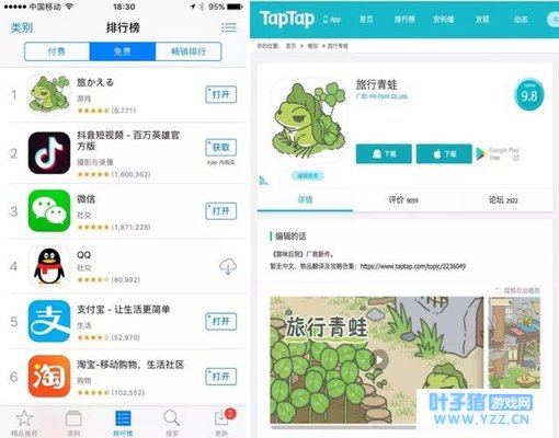 《旅行青蛙》在App Store免费榜上的排名(左),在TapTap上的评分。 按投入精力、沉迷度来进行划分,可以将游戏分为重度游戏、中度游戏和轻度游戏。其中,轻度游戏花费的时间、金钱、流量最少,占用的是用户的碎片化时间,游戏操作简单易懂,用户玩此类游戏以减压为主要目的。 社交游戏、网页游戏、H5游戏、甚至最近才开始出现的微信小游戏,都属于轻游戏的范畴。不久前,张小龙在微信公开课上还公布了一组惊人的数字,上线还未满月的小游戏累计使用用户数量3.1亿,做作为小游戏代表作之一的跳一跳,其用户次日留存率达到65%,7日留存率更高达52%,数倍远超于移动游戏行业的平均水平。 这一消息相信让许多游戏开发者欣喜难眠,一个新的游戏行业格局或许会因为小程序的逐渐发展,发生翻天覆地的改变。这种欣喜,随着《旅行青蛙》这一放置类游戏的爆火进一步得到了提升。 高仿已经出现。现在,在App Store里用中文搜索《旅行青蛙》,首先跳出来的应用中真的有一款名叫《旅行青蛙》的中文游戏,并且是付费产品,需要30元,从游戏介绍上看它倒像是《旅行青蛙》和《跳一跳》的结合体。随后,这款山寨版的《旅行青蛙》甚至登陆了App Store中国区付费榜的第一名。 在日本,放置类游戏已经收获了相对稳定的热度,氪金用户也不在少数。 放置类游戏可以分为很多种,爆红的《旅行青蛙》和《猫咪后院》都属于经营放置类游戏,其余的还包括挂机增生放置类游戏、RPG放置类游戏,以上放置类游戏的本质均是以“点触”和“等待”为核心操作,其中有不少爆款游戏以魔性画风著称,比如此前曾在国内风靡一时的《兄贵草泥马》《百万岁婆婆》《大叔鸡蛋》等。 极光大数据行业研究院在报告中称,放置类游戏的变现模式跟普通游戏没什么差别,依旧可以通过氪金、IP挖掘等模式进行变现。除了游戏通用货币的充值之外,游戏厂商可通过挖掘IP相关的周边诸如手办、电影等进行变现。 此前,Hit-Point就在香港旺角的购物中心开了一家《猫咪后院》快闪店,店铺装修成游戏中的庭院场景,顺便卖出了不少杯子、抱枕等周边产品,此后根据《猫咪后院》改编的真人电影便于2017年4月在日本上映了。 放置游戏的火为何而来 陈书艺认为,在所有轻游戏中,放置类游戏本质上比较小众或者说二次元文化,大多数人很难沉浸进去,在当下重度游戏风行、套路游戏成主流的行情下,这样的放置类游戏算是一股清流。 很显然,这并不足以让《旅行青蛙》成为App Store中的登顶产品。更重要的是,《旅行青蛙》为我们提供了情感上的投入和宣泄寄托。母爱一直是近年流行的移情方向,无论是鹿晗还是TFboy,自称“亲妈粉”的90后粉丝越来越多,也就不难想象一夜之间你的朋友都给青蛙当了妈。 此外,对于重度游戏玩家来说,《旅行青蛙》和《猫咪后院》这两款游戏的GamePlay三句话就能说完,操作、故事情节上均没什么特色亮点。的确,放置类游戏缺乏打斗类游戏带来的高浓度刺激和满足感,但也提供了不一样的情感收益。 TapTap上游戏用户对《旅行青蛙》的评价中,温馨和治愈都是主要关键词。几条排名靠前的评论中, “这个游戏并不只是游戏,它还能给你感悟人生。请用心去对待蛙蛙,如同对待你自己”获得了很高的点赞量。
