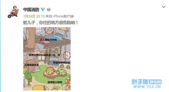 首先出场的是我们的蓝V官微“中国消防”,官微皮下用专业的分析告诉了我们小青蛙质朴温馨的家其实存在着众多火灾隐患,给网友上了一堂生动有趣的科普课。