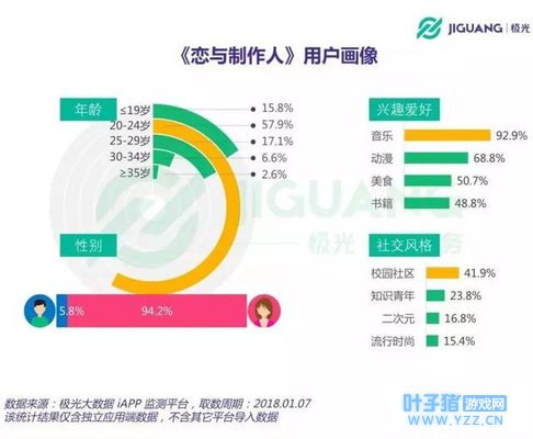 这群女人,既养得起男人,又能照顾好儿子。 2018年才刚开始不久,手游市场就出现了不少爆款,《QQ飞车》、《跳一跳》、《恋与制作人》、《旅行青蛙》等等都以不同的姿态突破了重度大作的包围圈。而让人意想不到的是,这些爆款背后,女性玩家竟然扛起了大旗,成为了最大的推动力。“女性”这个以往不受重视的群体,也正式成为了游戏圈一股新兴的力量,据手游那点事了解,已经有不少厂商开始筹备女性向的游戏。那么这些爆款是如何拿下女性用户的?女性在游戏里玩的到底是什么?未来手游厂商们又将如何挖掘出“女性”玩家更大的潜力? 一、这些爆款是怎么拿下“女性”玩家的? 1.《恋与制作人》——四个男人无死角戳中少女心 在大众的印象中,女性喜欢的游戏大多偏向消除类、装扮类等要么极其简单、要么注重画面的类型,但《恋与制作人》的出现似乎一改过往的印象,更加深入地挖掘了女性在游戏中的真正需求。 《恋与制作人》12月14日在iOS平台首发,上线一个月流水就超过了2亿,曾开发《奇迹暖暖》系列游戏的研发商——苏州叠纸在2017年尾制造了这样一款现象级游戏。据极光数据显示,《恋与制作人》的女性用户占比达到94.2%,其中20-24岁的用户超过一半达57.9%。