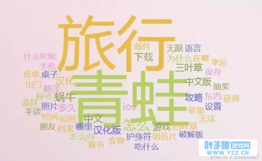 《旅行的青蛙》究竟怎么玩?其实它是一款非常简单的游戏,只有庭院和房间两个场景,玩家除了收割三叶草,为青蛙准备便当行李之外,几乎不需要花费任何金钱和时间。与青蛙的交流就是它寄回来的土特产和明信片。 那么,关注《旅行青蛙》的人都在关心什么呢?根据指数后台数据生成的词云显示,“三叶草”“吃什么”“出门”等与游戏内容相关的关键词受到了广泛的关注,这也显示了《旅行青蛙》游戏独特的魅力。