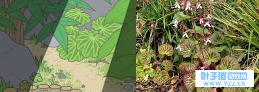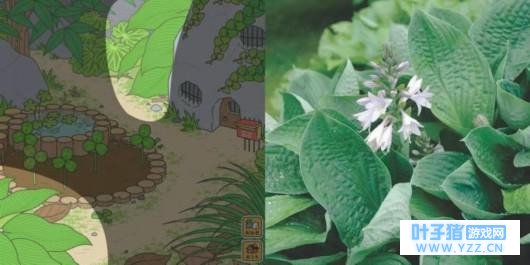 当中这种,推测应为虎耳草的品种Saxifraga stolonifera'Cuscutiformis'。 之所以叫虎耳草,是因为它圆圆又毛茸茸的叶子很像老虎耳朵。这只“老虎耳朵”极为耐阴,经常晒不到太阳也没问题,很好种,加之肥厚的叶子和开花时细碎的小花都颇具观赏价值,所以是很受欢迎的园艺品种。 值得一提的是,游戏的美工很讲究,特别把这个虎耳草的品种画得有些隐约透红,要知道,日本常见的这个类型在叶片的白色脉纹之间还有红色的斑纹,而中国常见栽培的虎耳草叶片上只有白色脉纹。游戏用这种方式,“暗示”这只日本青蛙对于本土植物的执念。 玉簪