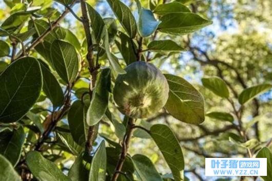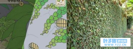 把视线拉到庭院的右上角,这里的小石屋上爬着一种植物,应当是薜荔(Ficus pumila)。 薜荔是榕属的植物,很多人不知道,薜荔其实有“双重性格”:一种性格,就像游戏中的那样显得“柔软”,叶片很小,层层叠叠,紧贴攀附物的表面;另一种性格则显得“独立”,在生长到一定程度后会长出结果枝,顾名思义,结果枝可以长出榕属植物标志性的隐花果,这个可以结果的枝条非常粗壮,叶片也很大,看上去和不结果的攀援枝完全不像同一种植物。 对美食爱好者而言,薜荔结出的隐花果还能食用,最主要的用途是制作凉粉(冰粉),因此薜荔也俗称凉粉果、冰粉果。