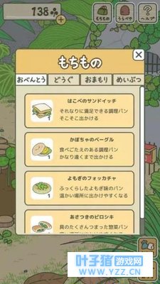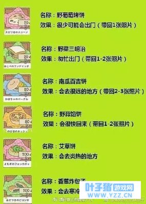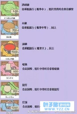 便当和道具基本都可以在商店买到,具体的使用请见图。注意暗示天气和返回速度的口粮,防止迷路的灯具,以及可能带来好收获的护身符。碗的作用是划船,包裹布和帐篷不同款式的区别不大,基本可以随便买。下面是便当和道具的使用攻略,你选好的道具和便当,将决定的你青蛙去哪里旅行,拍到什么写真回来。