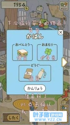 7、【室内】最核心的功能就是左下角的【准备行李】。其中蓝色页面为【背包】,也就是蛙蛙下一次必然会带走的行李,选择好以后按白色按键确定保存。