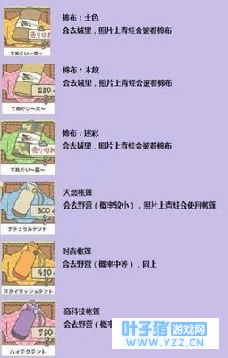 首先游戏的主要玩法就是通过收集三叶草去商城买食物、幸运符、道具等东西。然后你养的青蛙会带着这些东西出门旅行,然后旅行途中会邮寄回家明信片,回来还会给你带当地的土特产,而不同的道具组合会触发不同的剧情。 主界面分为庭院和室内,上方为【现有物品】、【记录】、【帮助】三个子菜单 【现有物品】包括【便当】(口粮)、【道具】、【护身符】和【特产】。 便当和道具基本都可以在商店买到,具体的使用请见图。注意暗示天气和返回速度的口粮,防止迷路的灯具,以及可能带来好收获的护身符。碗的作用是划船,包裹布和帐篷不同款式的区别不大,基本可以随便买。 庭院内的田地,随时间长出三叶草,日常采集三叶草作为货币。偶尔掉落的四叶草作为一次性护身符使用。 三叶草数量处的【黄金+号】和所有游戏一样就是dalao的入口,佛系玩家就不要点开了。 【室内】最核心的功能就是左下角的【准备行李】。其中蓝色页面为【背包】,也就是蛙蛙下一次必然会带走的行李,选择好以后按白色按键确定保存 商店有便当和道具卖,使用三叶草购买。不同的便当和道具的组合,会决定了你的青蛙每次旅行地点和遭遇。右上角还有【抽奖】,5张券来一发,奖品内容下面也有图解。抽奖券可能由蛙旅行带回,朋友也会寄来,购物时还会随机掉落。 【记录】包括【图鉴】(珍稀掉落以及特产目录)【相册】(蛙蛙旅行的照片)。 图鉴只要开过就永久保存,相册是可删除的,切勿手滑!!!!!!!!!!特意加粗就是说一定谨记 目前网络上已经有安卓的汉化版(9游上可以免费下载)和破解版(玩个单机你还要破解,请别让小编鄙视你),相信苹果版本也会很快就会出现。