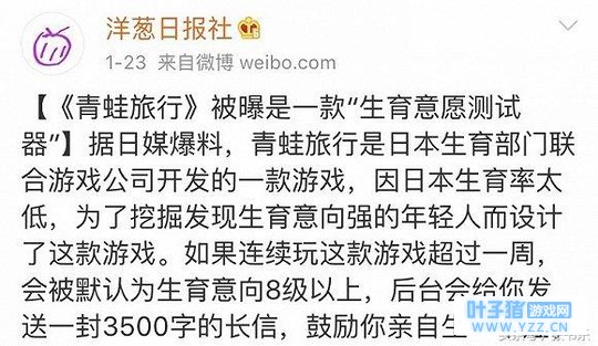 一 最早的讹传是关于刺激生育率。 一些媒体声称,《旅行青蛙》是日本生育部门联合游戏公司开发的一款游戏,设计的初衷是因为日本生育率太低,所以要挖掘发现生育意向强的年轻人。如果连续玩这款游戏超过一周,会被默认为生育意向8级以上,后台会发给你一封3500字的长信,鼓励你亲自生一个孩子。 经过媒体调查发现,原来段话的出处是以编造啼笑皆非的假资讯来娱乐大众的洋葱日报社。 怎么就这么快被人信以为真了呢?除了话题奇葩外,还有一点容易引发人们的共鸣——过年的时点上,又是一轮青年们被家里老人、亲戚逼婚、逼生孩子的煎熬时刻了。 好吧!养个蛙,解决不了什么问题……