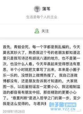 这位散播谣言的人也出来“辟谣”了,表示关于青蛙会死的消息每一个字都是自己瞎编的。 这是一篇“洋葱资讯”!大家安心养蛙!各位养蛙的老母亲安心上班吧。