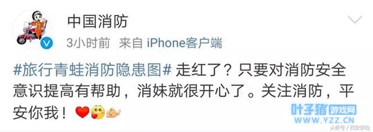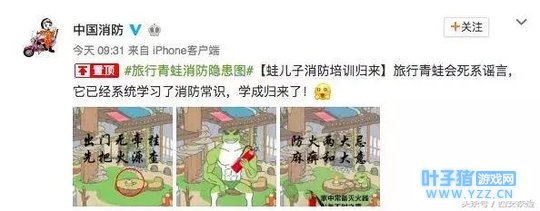图片来源:@中国消防 今天,公安部消防局又发微博,称旅行青蛙会死系谣言,它已经系统学习了消防常识,学成归来了!