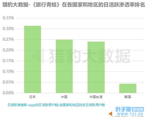 从猎豹大数据看,《旅行青蛙》这款游戏以女性用户为主,占到了整体用户的70%以上,多为一线城市30-40岁的用户,这些用户或为漂泊在外的年轻白领,或为大龄单身女青年,也就是现在流行的“佛系”青年。她们喜欢称呼这只蛙为“儿砸”。 从猎豹大数据的日活跃渗透率看,《旅行青蛙》目前活跃率最高的是日本,其次是中国和中国台湾,但是由于各国家和地区的移动互联网人口基数的巨大差异,从用户规模上来说,中国的用户数量远远反超日本。