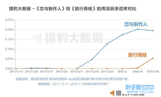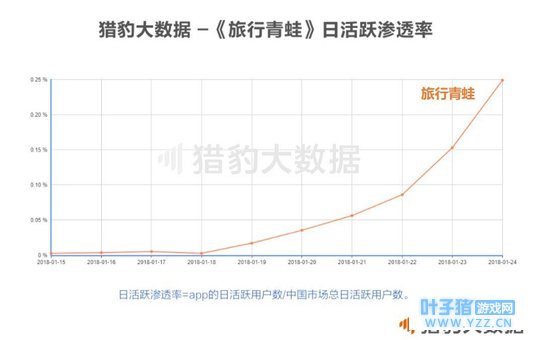 在今年1月,市场上相继出现了三款热门游戏,分别是《恋与制作人》、微信小程序游戏跳一跳和《旅行青蛙》,这其中,《旅行青蛙》出现的最晚,从猎豹大数据看,从1月18日开始,《旅行青蛙》开始了爆发性增长,日活跃渗透率直线上升,到目前持续了将近一周时间。 虽然火的最晚,但《旅行青蛙》的热度却一点也不比微信跳一跳和《恋与制作人》差,从其微信指数的增长曲线看,《旅行青蛙》的增长势头已经超过了微信跳一跳和《恋与制作人》。