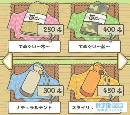 てぬぐい~木~ 布手巾 原木色 能感受到木质的温暖 ps.:会去城里,照片上青蛙会披着棉布 てぬぐい~装~ 布手巾 迷彩色 融入自然风景的迷彩材质 ps.:会去城里,照片上青蛙会披着棉布 ナチュラルテント 自然帐篷 简单舒适,入门级的帐篷 ps.:会去野营(概率较小),照片中青蛙会用帐篷 スタイリッシュテント 时尚帐篷 外表时尚的标准帐篷 ps.:会去野营(概率中等),照片中青蛙会用帐篷