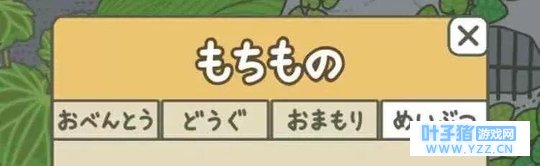点击「もちもの」,又会出现一个土黄色窗口,写着 「おベンとう」、「どうぐ」、「おまもり」、「めいぶつ」。 意思分别是便当、道具、护身符、特产。