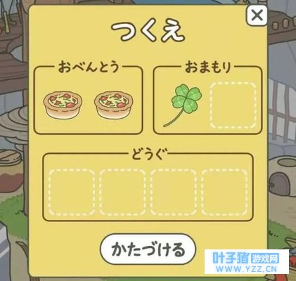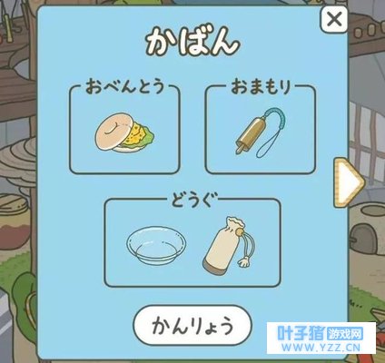 点击「したく」,会出现蓝色 「かばん」 (背包)界面,这里装的是蛙儿出门时要带的东西,把便当、护身符和道具都准备过后,点击下方 「かんりょう」 即可。