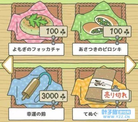 よもぎのフォッカチャ 艾蒿小麦饼 ps.:会去炎热的地方 あさつきのピロシキ 香葱饼 ps.:会去寒冷的地方 幸運の鈴 幸运铃铛 ps.:会带来好运,可以重复使用,很划算 てぬぐい~地~ 布手巾 大地色 不是很华丽的自然土色 ps.:会去城里,照片上青蛙会披着棉布
