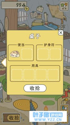 旅行青蛙 1.行李里放好食物,护身符,道具,桌子上没 放。二狗子会出去旅行,带走行李。 2.行李里啥也没有,桌子上也啥都没有。二狗子还是会出去旅行,但不会回来。除非你桌 子里放好食物。